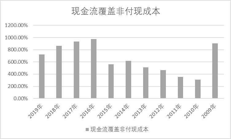 如果想要外部少融资,自身必需具备强大的造血能力,经营活动现金流就是一家企业的造血功能,经营活动现金流净额有能力覆盖维护性资本支出,我们可以用一个指标来刻画公司这种造血能力,经营活动现金流净额/非付现成本(资产减值准备+计提折旧+计提摊销+长期待摊费用+处置固定资产、无形资产和其他长期资产的损失)。