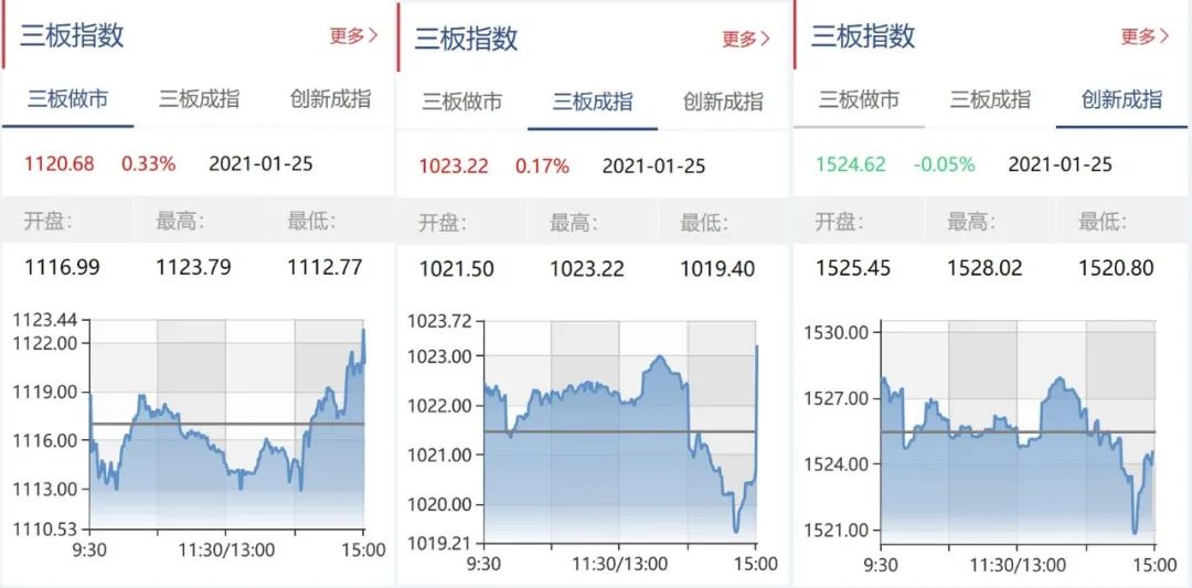 截至1月25日收盘,三板做市报1120.68点,上涨0.33%;三板成指报1023.22点,上涨0.17%;三板创新成指报1524.62点,下跌0.05%。