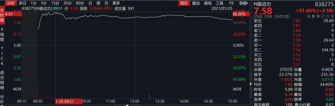 从今日盘面上看,驱动力以6.80元/股的价格开盘。开盘半个小时,涨幅便一路达至66%,后便一直保持50%左右的涨幅。