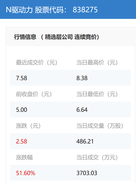 驱动力今日报收7.58元/股;换手率为23.37%;当日涨跌幅达51.60%;今日盘中最高价为8.38元/股;盘中最低价为6.64元/股;当日成交额达3703.03万元。