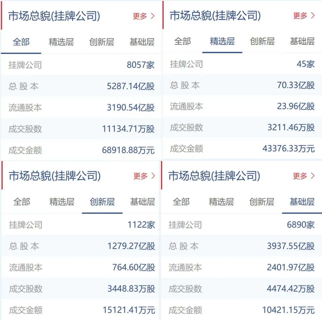 新三板挂牌公司总计8057家(精选层45家,创新层1122家,基础层6890家),总股本5287.14亿股,流通股本3190.54亿股。
