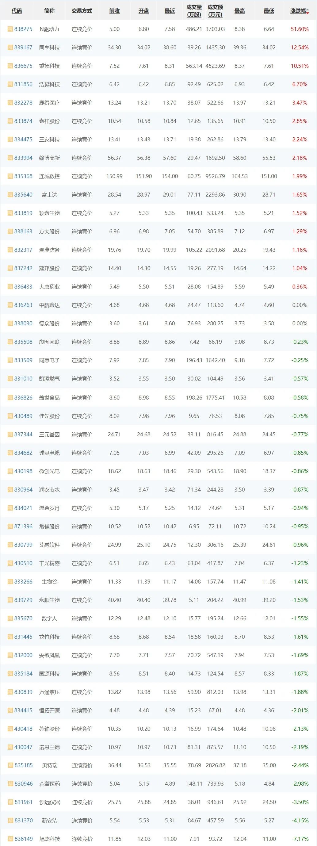 1月25日,精选层普跌,15家企业上涨,2家平盘,28家下跌。其中,驱动力(838275)首日挂牌,暴涨51.60%,涨幅居首;其次,同享科技(839167)上涨12.54%;旭杰科技(836149)跌幅居首,下跌7.17%;新安洁(831370)下跌4.15%居次;中航泰达(836263)、德众股份(838030)平盘。
