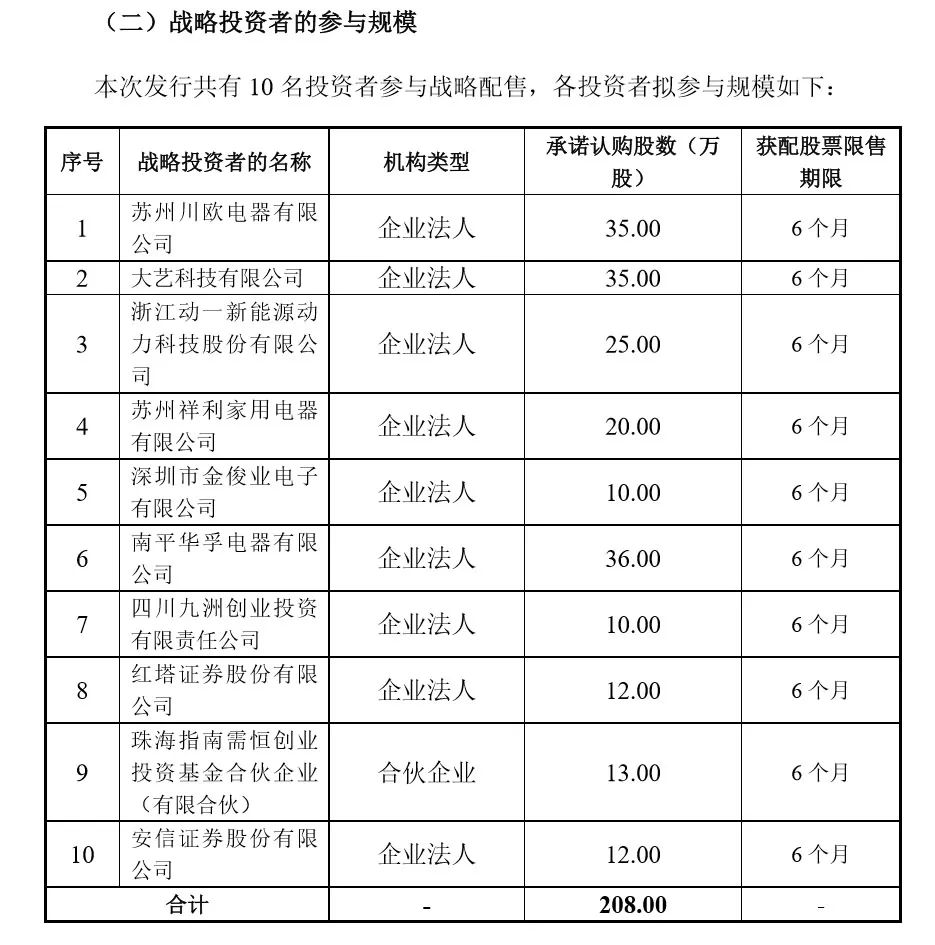 本次公开发行,长虹能源吸引来10家战略投资者,总共拟认购208万股。