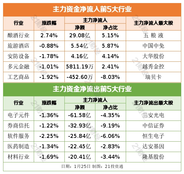 1月25日,A股三大指数收盘涨跌不一,沪指与深成指小幅收涨;创业板指冲高回落,最终绿盘报收,3400点整数关口得而复失。两市成交额12083亿元,行业板块呈现普跌态势,逾3000只股票下跌,白酒股大涨。