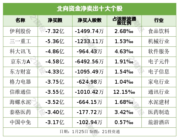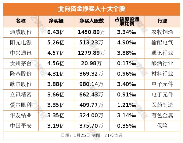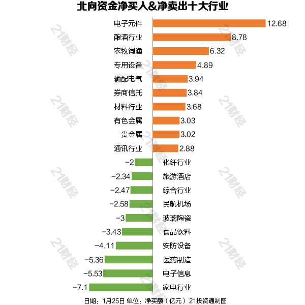据21投资通(微信号ID:touzit21)智能监测,1月25日,北向资金净买入19.31亿元,其中沪股通净买入16.27亿元,深股通净买入3.04亿元。