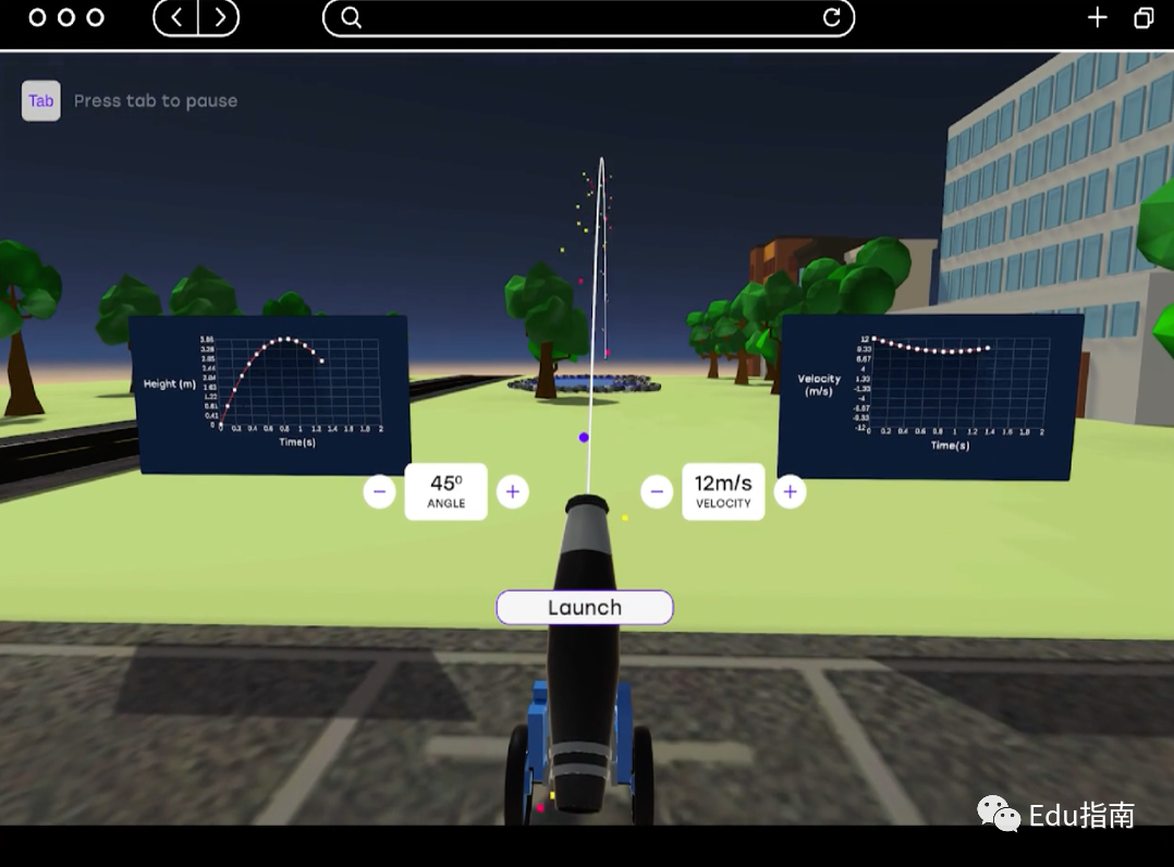 图示为:通过Inspirit平台的VR实验室示例,进行物理教学,抛物线、射程、角度、速度等