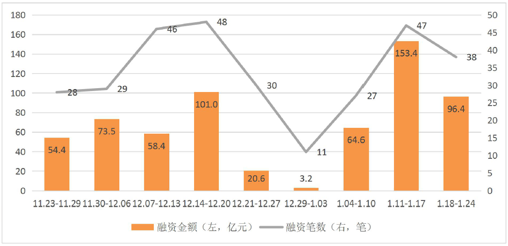 2020年12月14日-2020年12月20日期间融资金额突破百亿,后两周因节假日影响,融资金额大幅缩水。2020年12月29日以来,融资逐步持续回暖,融资金额最高达到153.4亿元,上周有所回落。