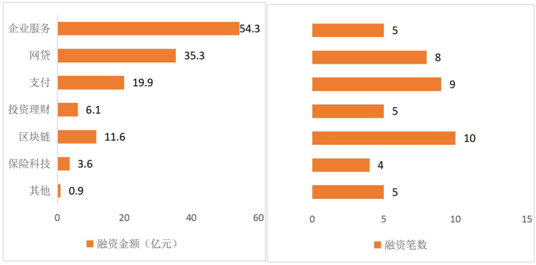 4. 企业服务类融资54.3亿元,区块链领域获投数量最多