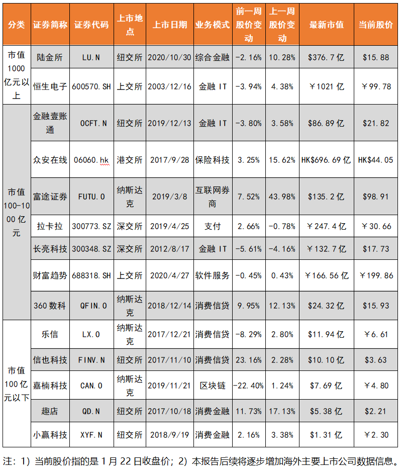 在市值1000亿元以上的公司里,陆金所与恒生电子股价均有所回升,分别涨了10.3%、4.4%;在在市值100亿元以下的公司里,趣店股价涨了17.1%,其余涨幅在2%左右。