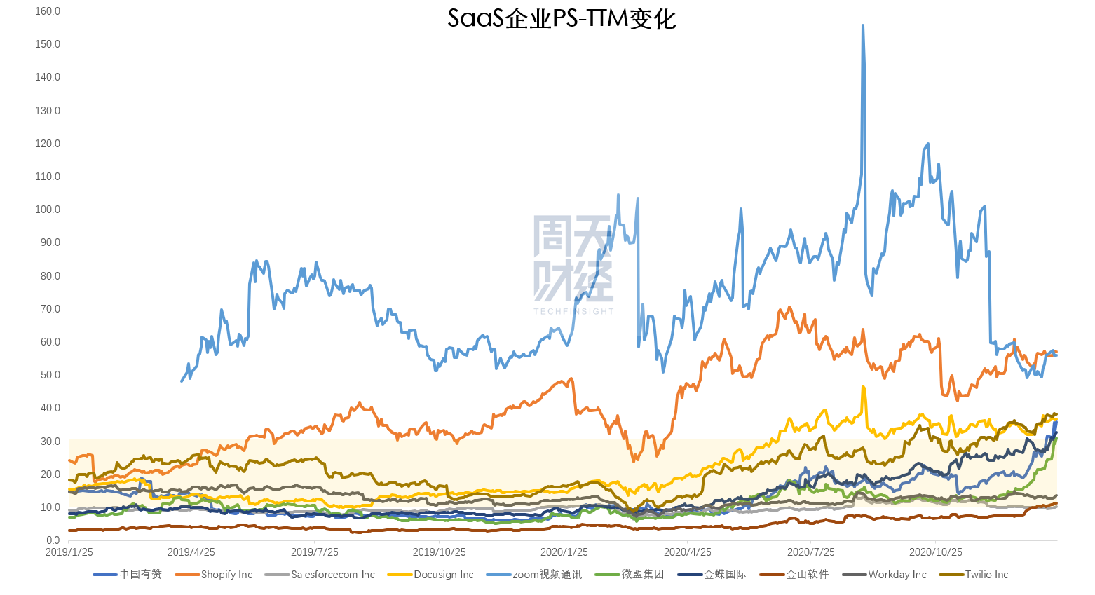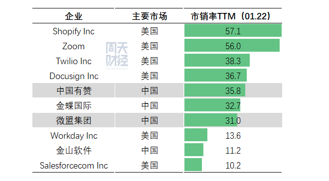 而如果按照 2021 年 1 月 22 日的市销率 -TTM 计算,目前还处在传统认为 10~30 倍区间的企业只有三家,分别是 Workday、Salesforce 以及金山软件,其他所有企业都已超过 30 倍市销率。换句话说,老牌的、业务相对稳定的服务商吃到的红利相对较小,而新的、所谓更具「想象力」的企业,也就增长越明显,市销率一度上窜到 160 倍的 zoom 便是典型代表。