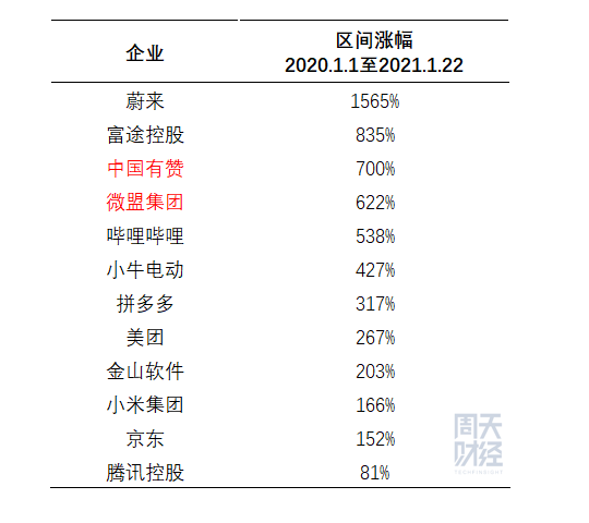 截至 1 月 24 日,微盟 2021 年上涨 86.5%,有赞上涨 73.2%,与此同时,两家公司均在 2020 年获得了超过 300% 的涨幅,换言之,如果从 2020 年的 1 月 1 日算起,买两家公司中的任意一家,持有到现在都能获得近 700% 的涨幅。