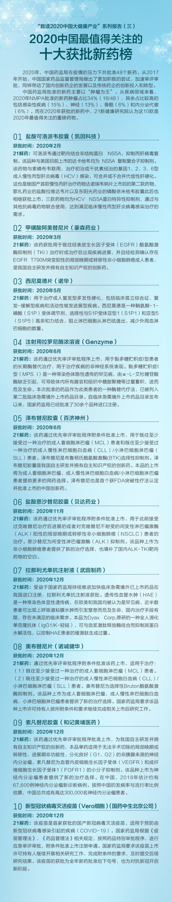 大健康行业,政策与技术是主要驱动力,新药是技术创新的主要结晶。而新药审批又事关企业投资与研发方向。没有新药获批上市,就没有商业化,企业也就没有生存之本。为了深刻把握中外新药发展脉络与动向,21新健康研究院特推出了“2020中国最值得关注的十大获批新药榜”、“2021全球最值得期待的十大新药榜”。