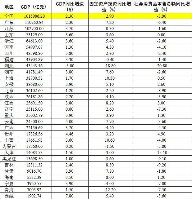 值得一提的是,目前公布GDP数据的29个省份中,共有18个省份GDP增速数据跑赢全国平均增速2.3%,广东GDP增速数据与全国持平。除湖北省之外,其余28个省区市均实现了经济正增长。