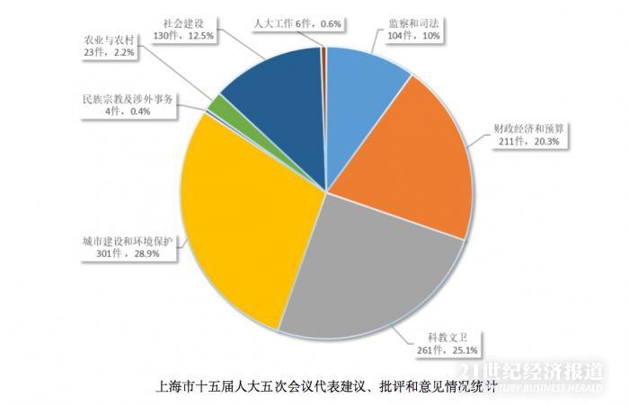 1月26日,21世纪经济报道记者从上海市人大了解到,截至1月26日下午13:30,上海市十五届人大五次会议大会秘书处共接收代表建议1040件,由430位代表提出。其中,城市建设和环境保护,科教文卫以及财政经济和预算是最受关注的三大领域。