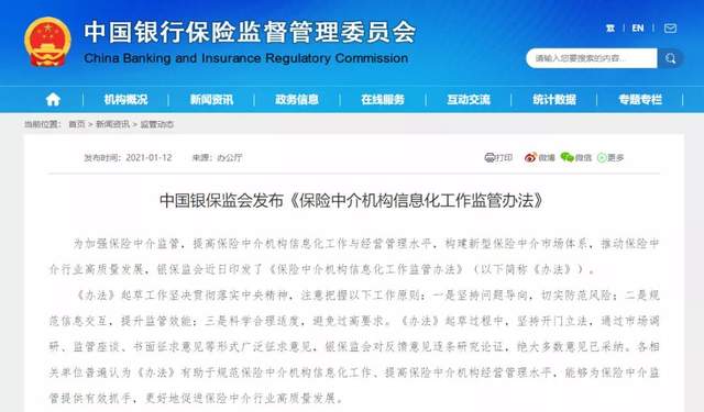 2021年1月,银保监会发布《保险中介机构信息化工作监管办法》,自2021年2月1日起施行,过渡期一年,信息化工作不符合要求的中介机构,将不得经营保险中介业务,提高了准入门槛。