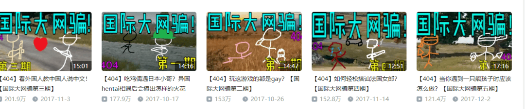 当时最具有代表性的视频UP主主要是“404NTFounD”,此外“某幻君”以及“吴织亚切大忽悠”也会偶尔制作“国际网骗”类视频。