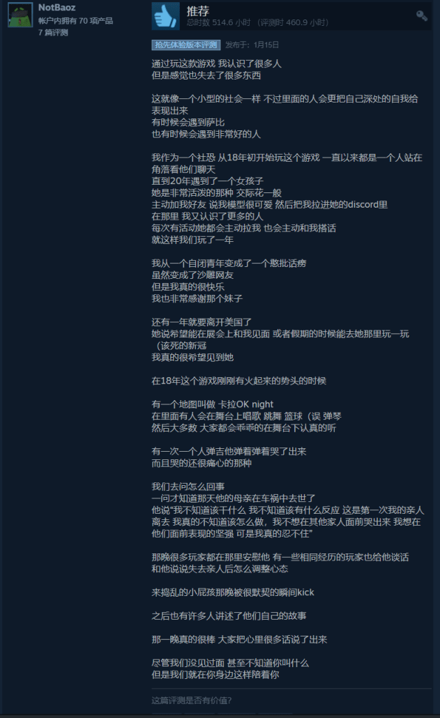不少玩家在评测中感叹道在这个游戏里与来自全球各地的人们交流,虽然偶尔还是会遇见不友好的人,但整体上仍是收获良多的,也认识了许多朋友,倾诉放松了自己,甚至还锻炼了口语。