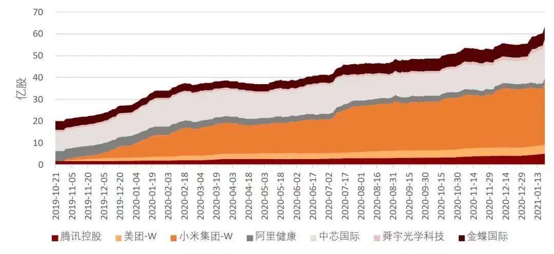 图1:港股通在港股主要科技公司持股数量不断上升(亿股)