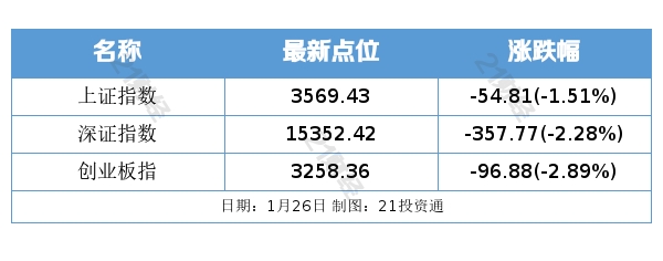 26日,A股三大指数全天下行,两市合计成交1.01万亿元,创业板跌近3%。航天军工板块领跌。
