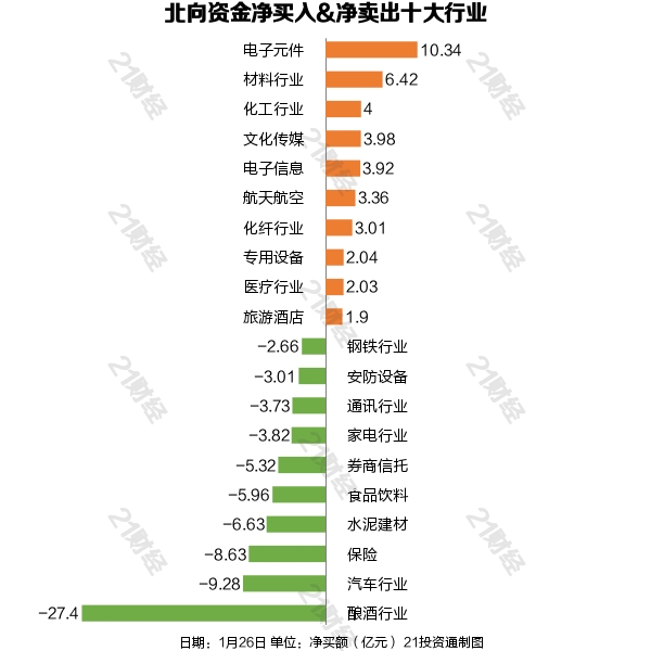 其中,增持了35个行业,电子元件居首,净买入金额达10.34亿元。减持了25个行业,其中酿酒行业最多,净卖出金额达27.40亿元。