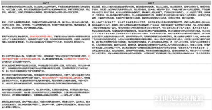 在关注重点工作不变的同时,变化更加值得关注。21世纪经济报道记者梳理,相比去年,今年出现了一些新提法:整治名实不符金融产品、推动大型银行向中小银行输出风控工具和技术等。