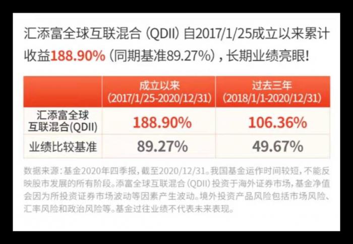 以其从2017年1月25日开始管理的汇添富全球互联混合(QDII)为例,2020年度四季报显示,截至2020年末,该基金成立以来的收益率达到188.9%,远超同期业绩比较基准89.27%的表现。