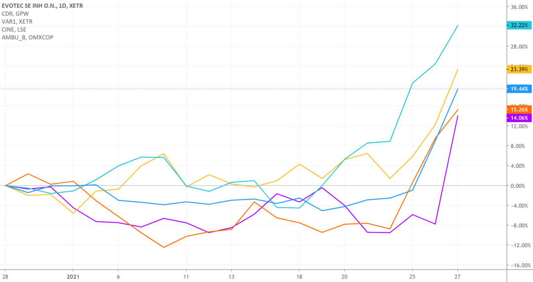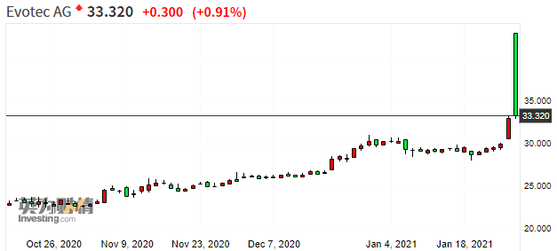首当其冲的自然是与梅尔文资本(游戏驿站事件中主要空头方)直接相关的股票。德国药企Evotec周三在法兰克福交易所最多一度上涨超30%,收盘上涨9.6%。梅尔文资本持有约占Evotec流通股6.2%比例的空头仓位。