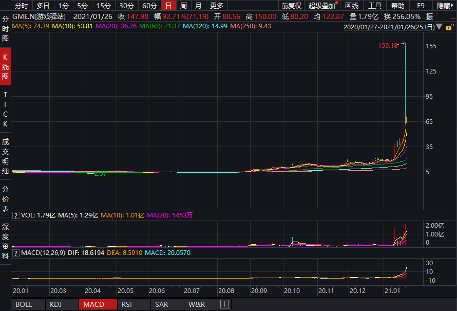 在散户疯狂推动下,游戏驿站仅年内就暴涨700%,周三盘前一度暴涨逾100%,截至周三收盘,公司股价大涨134.84%,报347.51美元,较去年4月低点2.57美元已暴涨近百倍。