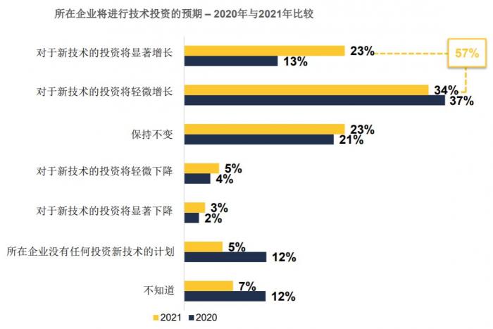 受访企业在2021年科技创新领域的趋势,同样表现出了较大的亮点。57%的受访者预计,所在企业将在2021年增加对于新技术的投资,该比例较2020年同期上升了7个百分点,其中表示新技术投资将显著增长的受访者比例达到了23%,接近总体样本的四分之一。