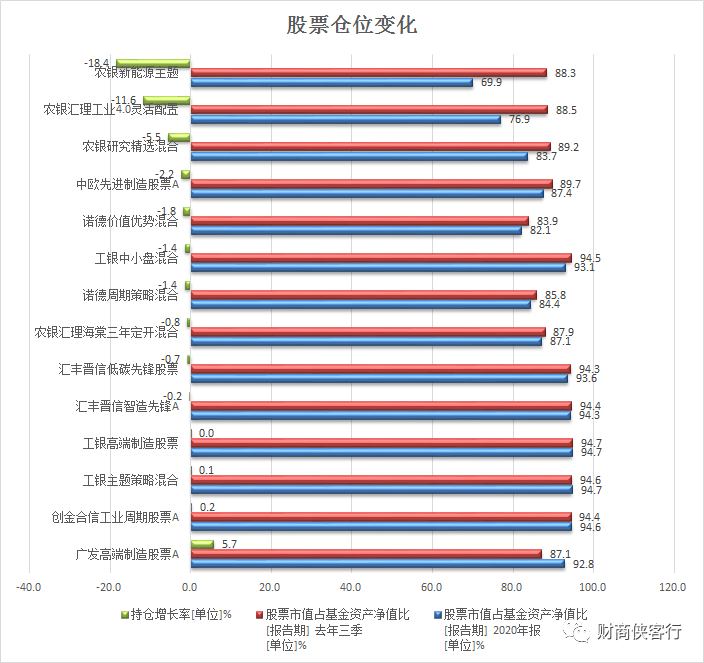 其中,冠军基金经理赵诣管理的农银新能源主题仓位降幅最大,从去年三季度末的88.3%大幅下降到69.9%,减仓幅度达到20%。
