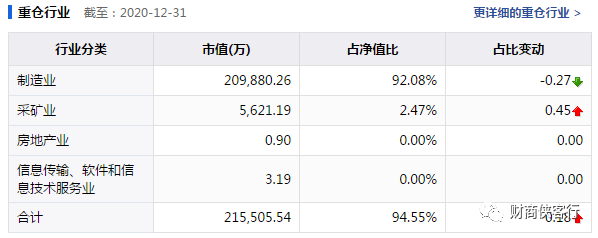 从基金四季报看,虽然管理规模出现激增,但权益类持仓并没有下降,甚至还出现小幅度上涨,感觉基金经理还是比较游刃有余的,基金配置的重点集中在制造业上。