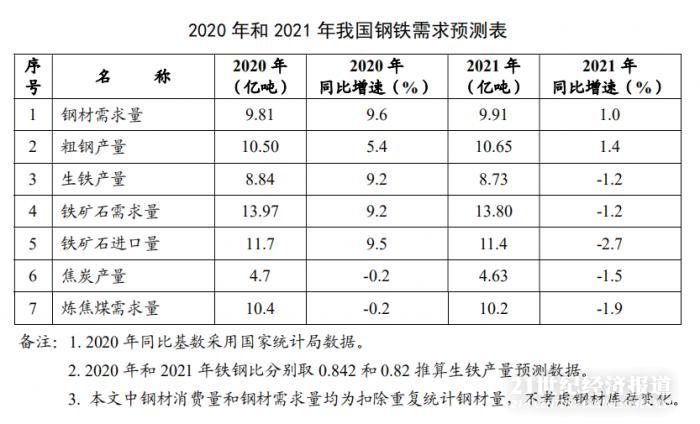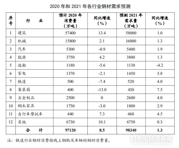 2020年12月21日,冶金工业规划研究院发布的《2021年中国钢铁需求预测成果》预计,2021年,中国经济和固定资产投资仍将保持较快增长态势,建筑、机械、汽车、能源、家电、铁道、集装箱、五金制品、钢木家具等行业钢材需求均将小幅增长,因而报告预测2021年中国钢材需求总量小幅增长。采用下游行业消费法预计,该报告预测2021年中国钢材需求量约9.83亿吨。