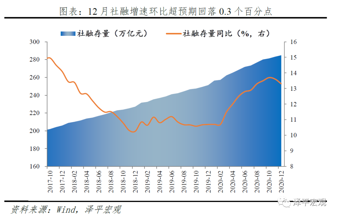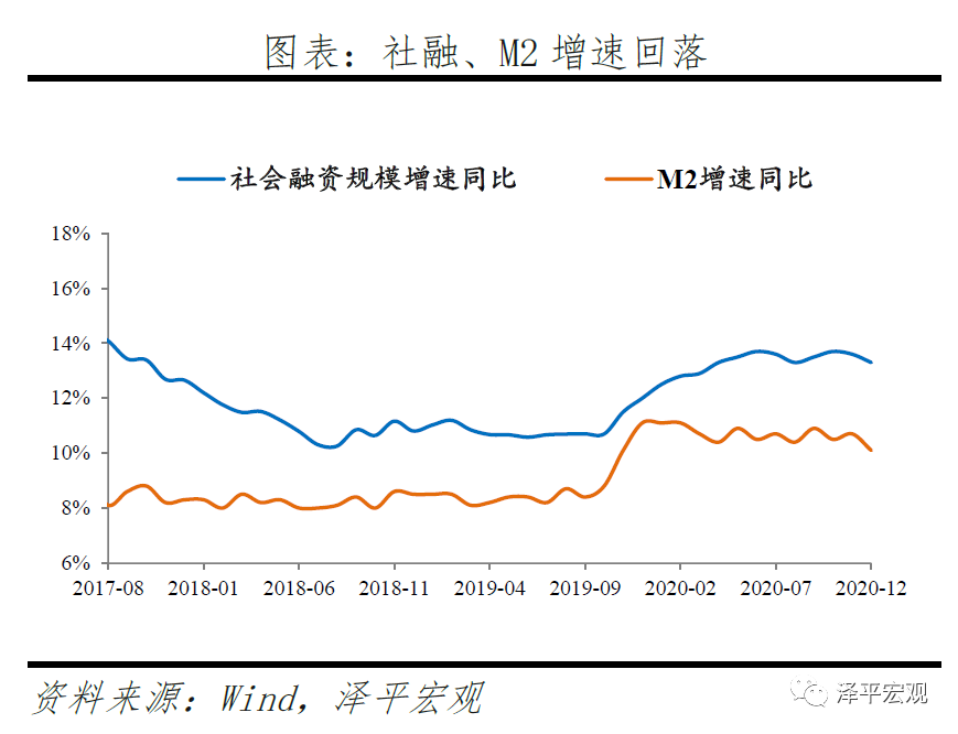 事实上,2020年11月以来,社融、M2增速已经开始回落,信用扩张进一步放缓。2020年12月存量社融增速13.3%,环比超预期下降0.3个百分点,12月M2同比增速10.1%,环比大幅回落0.6个百分点。信用扩张进一步放缓,流动性拐点进一步确认。