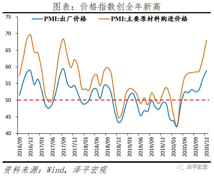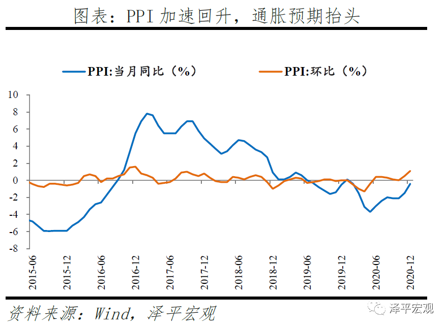 2020年11月以来,由于供需缺口、全球复苏共振、全球低利率等,原油、铜、铁矿石等大宗商品价格上涨,通胀预期抬头。海外维持宽松政策环境叠加疫苗大面积普及仍需时间,带动供需缺口维持高位,国内工业生产持续向好,大宗商品价格环比加速上涨。11、12月PPI环比增速分别加快至0.5%、1.1%,同比增速回升至-1.5%、-0.4%。