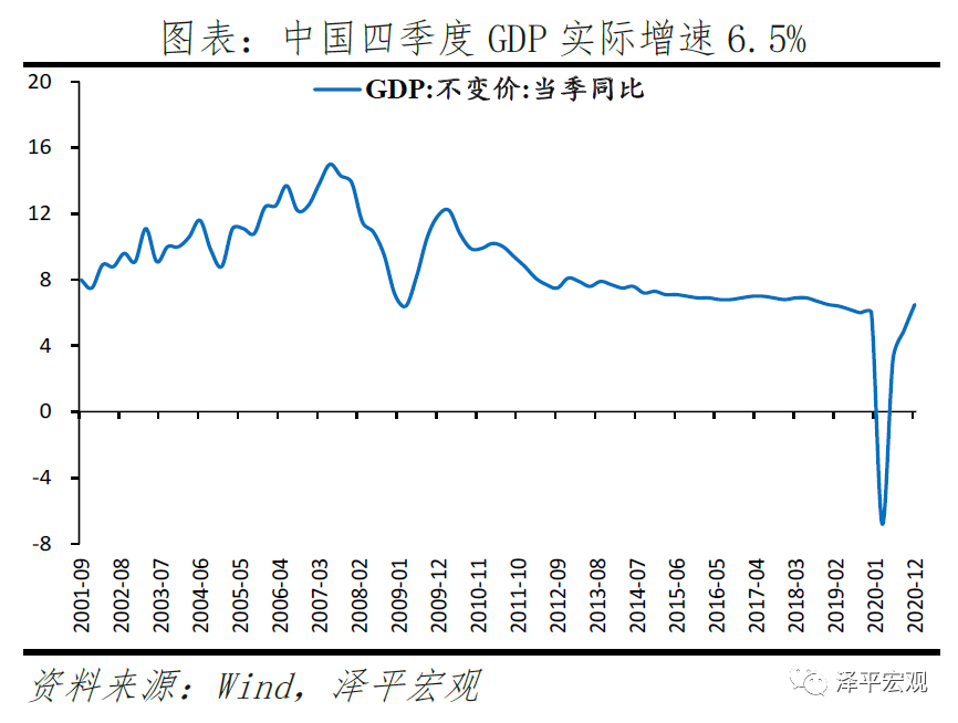 2020年四季度中国GDP实际增速6.5%,经济向潜在增长率回归。2020年全年,中国实际GDP增速2.3%,预计成为全球唯一一个正增长的主要经济体,四个季度GDP实际增速分别为-6.8%、3.2%、4.9%、6.5%,逐步向潜在增长率回归。