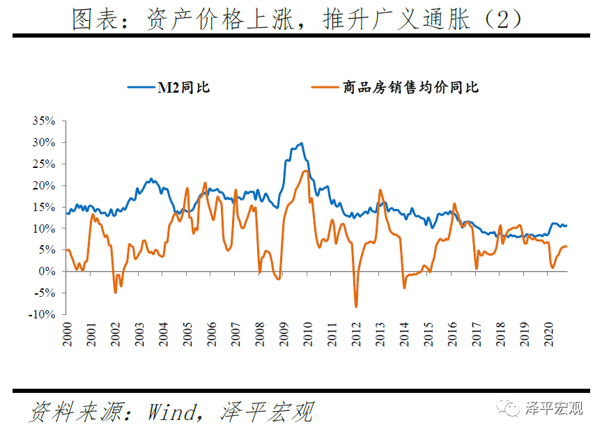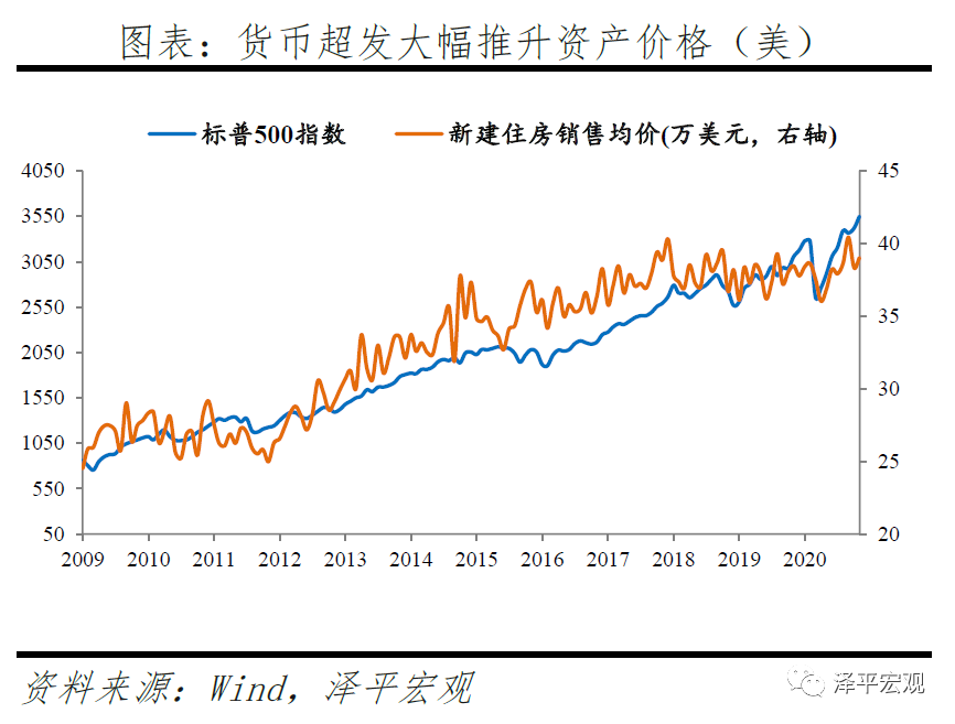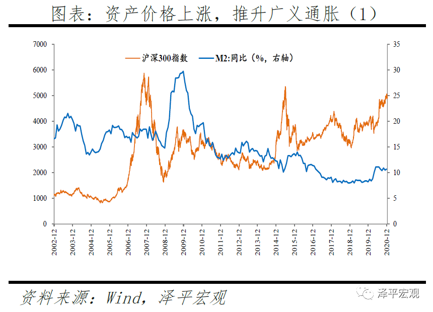 资产价格结构性泡沫化,上海、深圳、杭州等局部热点城市房价快上涨,股市“抱团”推升估值,推升广义通胀。2020年4-12月,上证综指、沪深300累计涨幅分别达到27%、42%,2021年1月多个交易日沪深两市成交金额超万亿元,A股市场抱团白马股为代表的核心资产,上海、深圳、杭州等部分热点城市房价快速上行。