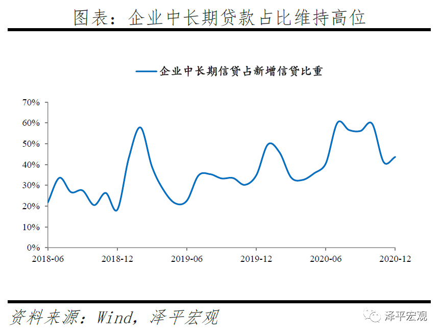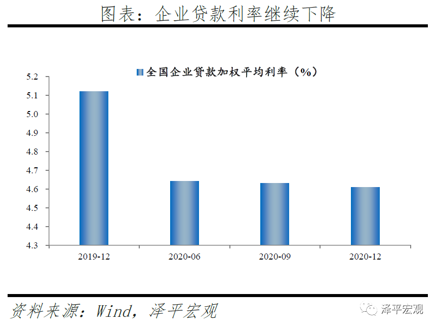 年末以来,广义流动性拐点出现,但结构性信用扩张仍在继续,企业中长期贷款持续增长,企业贷款利率继续下降。1)2020年12月,企业中长期贷款占新增信贷比重维持44%的高位水平。2)2020年,制造业中长期贷款余额增长35.2%,比上年高20个百分点,增速已连续14个月上升。3)2020年末,全国企业贷款加权平均利率为4.61%,较上年末下降0.51个百分点,较9月末下降0.02个百分点。