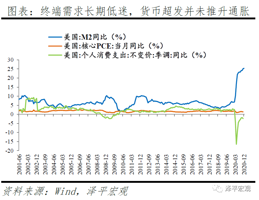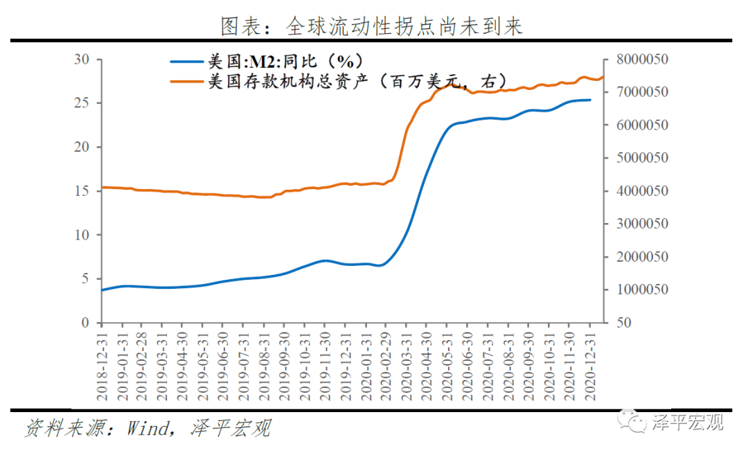 事实上,截至2020年年末,美联储资产负债表仍在继续扩张,M2增速维持在20%以上的历史高位。2021年,美国货币财政政策大概率继续维持宽松,助力经济恢复,全球流动性拐点尚未到来。