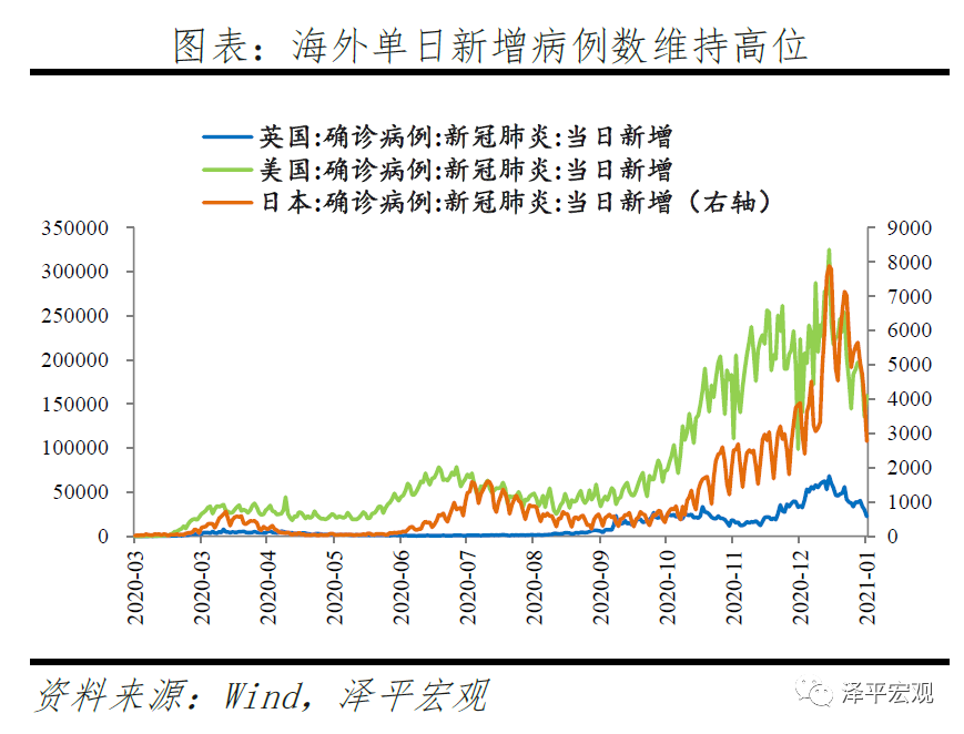 海外疫情仍然严峻,疫苗大规模普及尚需时日,全球经济复苏不确定性较大。2021年,制造业补库存、地产销售有望维持景气、财政刺激等因素共同拉动下,海外经济复苏是主基调,但多重风险仍存。其一,海外疫情仍然严重,美国单日新增病例数维持高位。其二,受疫苗供给、接种速度、民众接种意愿等因素制约,疫苗大规模普及仍需时间。其三,受制于疫情严峻、政府封锁政策再度强化,去年末以来欧美国家经济活动指数再度回落,美国非农就业人数意外减少,就业市场依然严峻。