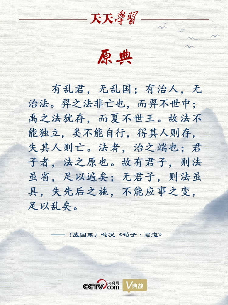 作为法家思想创始人的荀子,其本身又是儒家代表人物。他在儒家“为政在人”治国理念基础上,提出了一系列关于“人治”与“法治”关系的论点,如:“法者,治之端也;君子者,法之原也。故有君子,则法虽省,足以遍矣;无君子,则法虽具,失先后之施,不能应事之变,足以乱矣。”意思是法度是治国的前提,而君子是法度的本原。一旦得到了君子,法律虽然简单,也能解决普遍的社会问题;没有君子,法律再完备,也会导致社会的混乱。
