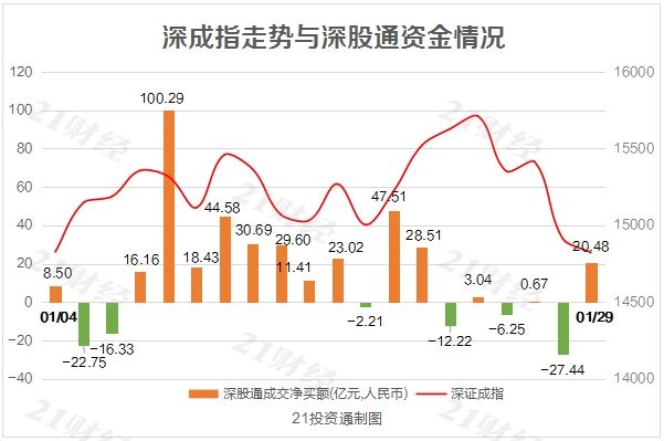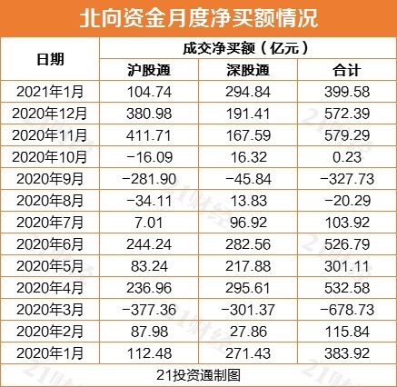 据21投资通(微信号ID:touzit21)统计,北向资金1月份累计净买入399.58亿元,其中,沪股通净买入104.74亿元,深股通净买入294.84亿元,与2020年11月、12月不同的是,北向资金在2021年1月更加青睐深市的股票。