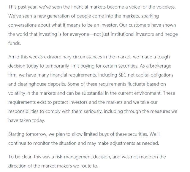 在声明中,Robinhood将稍早宣布的限制交易决定解释为“遵守美国证监会(SEC)对经纪交易商的资本金要求”,这个决定激怒了许多用户。该公司还称,“这些要求的存在是为了保护投资者和市场,我们有责任认真遵守这些要求,包括通过我们今天采取的措施。”