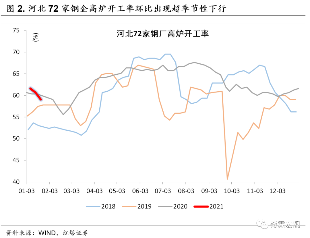 目前疫情爆发主要集中在河北、黑龙江、吉林等省份,北京、上海也零星有一些病例,高频数据显示这些地区的工业生产的确受了一些影响,比如河北72家钢厂的高炉开工率自1月初以来出现了超季节性的环比下行。