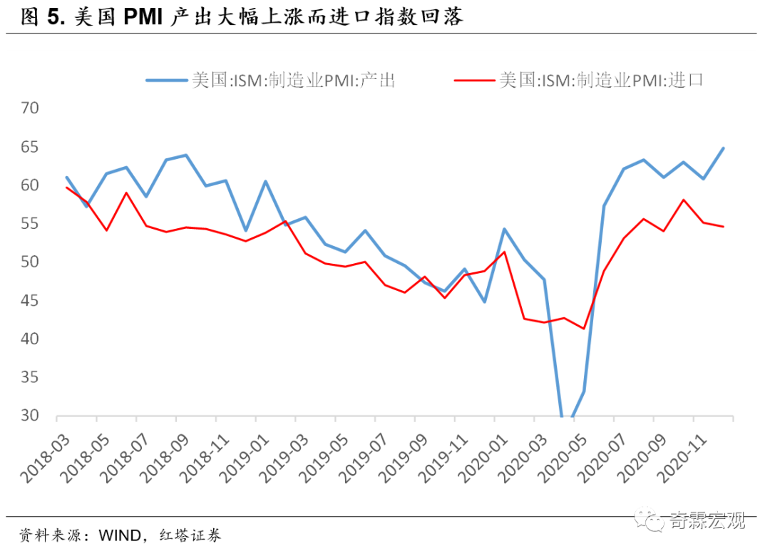 从数据来看,2020年12月美国PMI产出指数从60.8大幅回升至64.8,与之对应的是,美国PMI进口指数见顶回落了,从55.1下降到54.6。美国的工业总体产出指数从去年4月的91也已恢复到105.7,全部工业部门的产能利用率也从低位的70%不到回升到74.5%,已经和过去几年的均衡水平差距不大了。