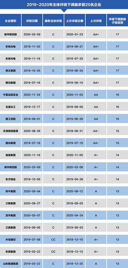 根据南财智库-21资管研究院统计,2019-2020年,违约债券主体最新评级与上一次评级相比,“跳水”5个及以上的评级子级(备注:从AAA到C评级共包含19个评级子级)的主体,占总数的比例为65.9%,其中“跳水”10个及以上评级子级的主体占总体比例的20.45%。例如,新华控股、东旭光电、西王集团、精功集团评级直接从AA+下调至CC,垂直“跳水”17个子级。