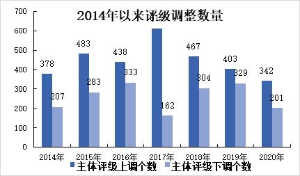 从评级调整角度,根据南财智库-21资管研究院统计,2014年以来,每年主体评级上调个数均高于评级下调个数,不过近三年来每年评级调整数量在逐步下降。