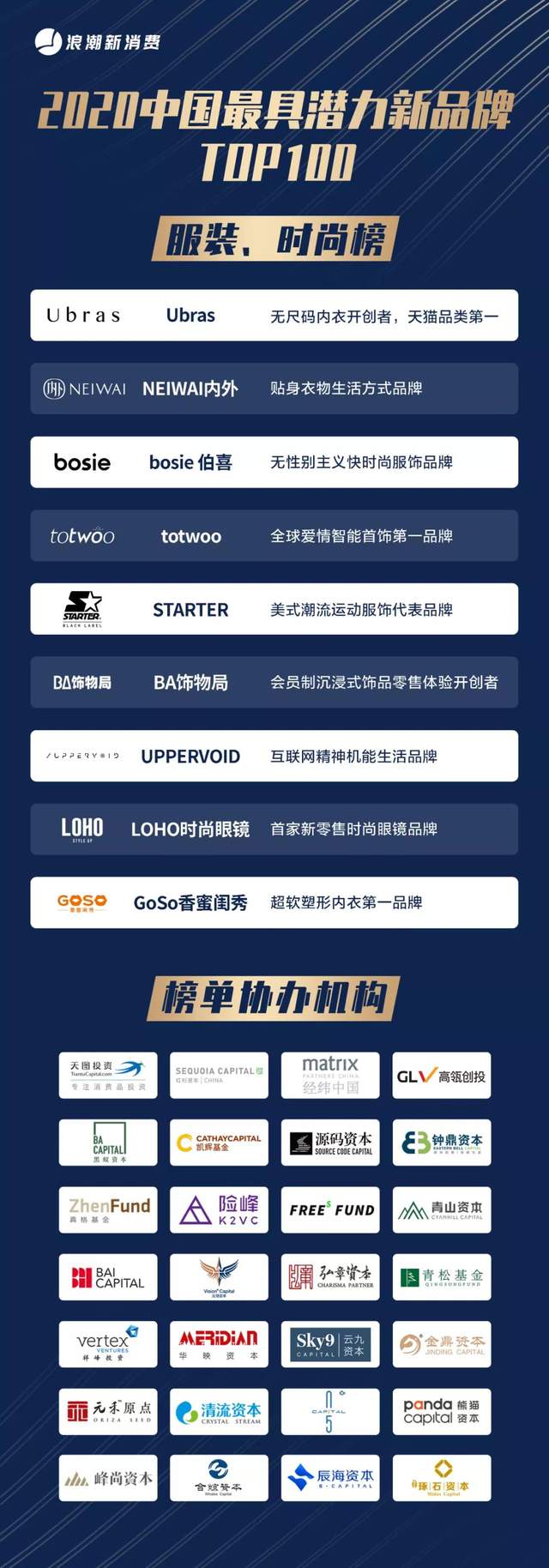 以下是《2020年中国最具潜力新消费品牌TOP100》服装、时尚类入榜企业: