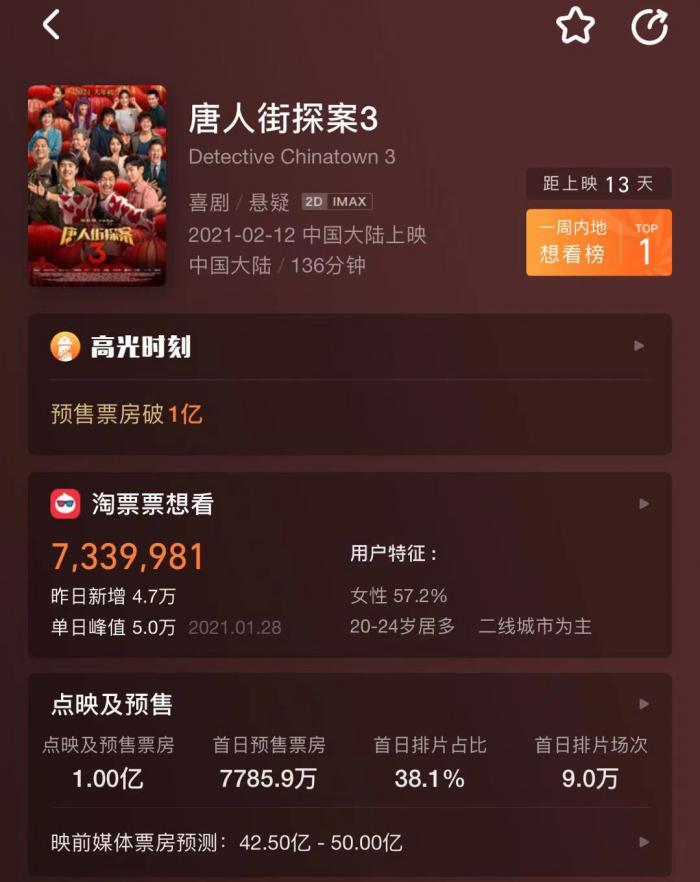 根据灯塔实时数据,截至1月30日20点03分,春节档预售开启36小时,电影《唐人街探案3》预售总票房破1亿,领跑2021年春节档预售大盘。
