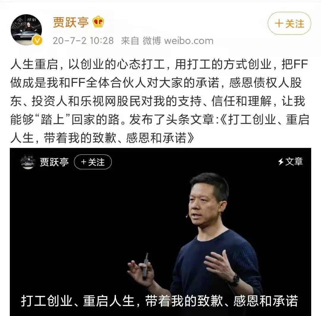 去年7月初,一封名为《打工创业、重启人生、带着我的致歉、感恩和承诺》的公开信出现在贾跃亭的个人微博中,他在这封公开信中这样写道。此外,公开信还宣布一年前在美国申请的个人重组案最终完成。