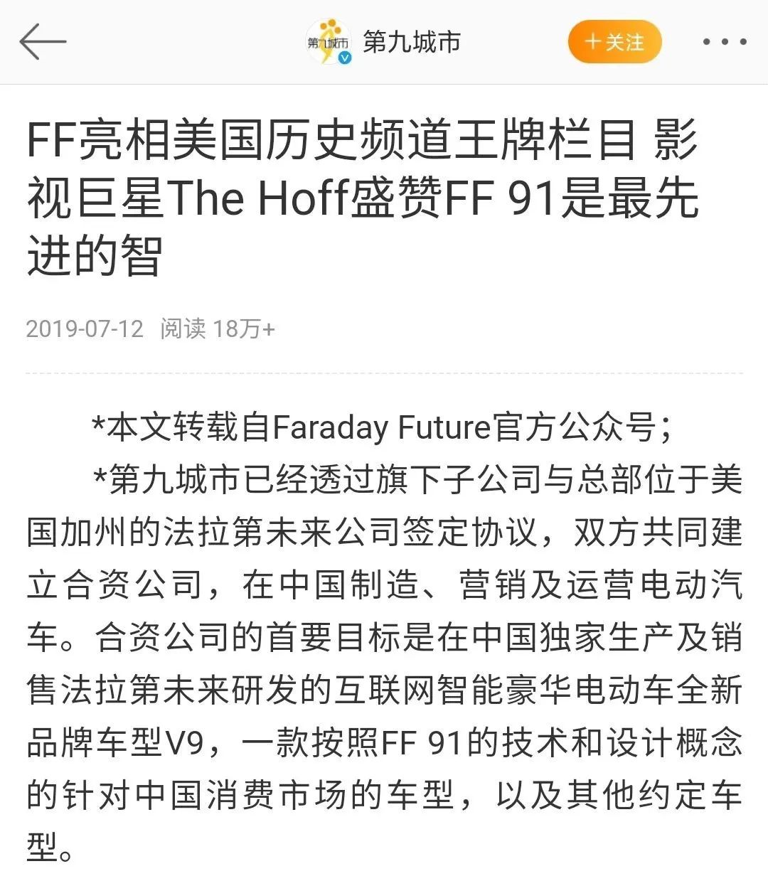 在毕福康对于融资快要失望之时,去年7月,第九城市通过旗下的子公司与FF签订协议。根据协议条款,双方共同建立合资公司,前者将以三个等额分期向FF注资最高达6亿美元,法拉第未来将向合资公司提供相关产权及资源。